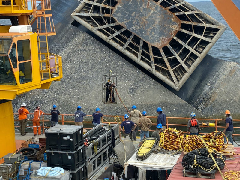 Οι δύτες εκτελούν αυτή τη διαδικασία πάνω και κάτω από το νερό. Η όλη επιχείρηση εξαρτάται από τις καιρικές συνθήκες και θα σταματήσουν εάν οι άνεμοι ξεπερνούν τα 15 μίλια / ώρα.
