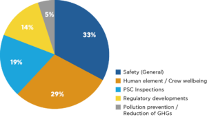 Στις 20 πρώτες θέσεις προτίμησης εμφανίζονται θέματα που σχετίζονται με την ασφάλεια, τον ανθρώπινο παράγοντα, τις επιθεωρήσεις και τους νέους κανονισμούς, όπως φαίνεται από την ποσοστιαία κατανομή τους ανά θεματική ενότητα του ερωτηματολογίου.