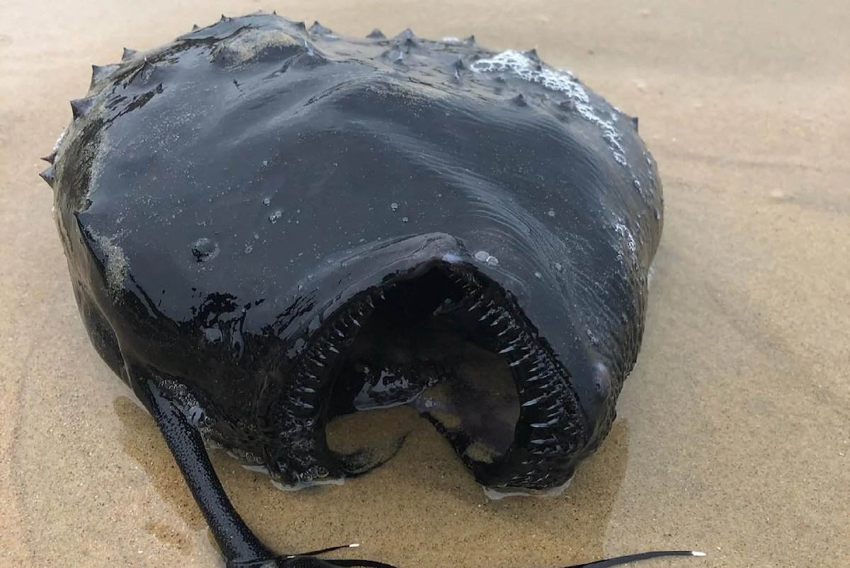 Με το στόμα ορθάνοιχτο, αποκαλύπτοντας τα μυτερά, μαύρα δόντια του, το θαλάσσιο πλάσμα, που ξεβράστηκε στην Καλιφόρνια, μοιάζει να έχει ξεπηδήσει από κάποια ταινία.