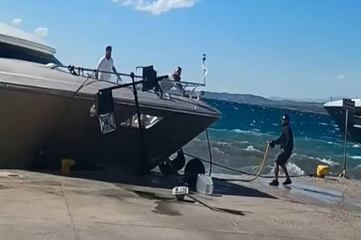 Σε βίντεο που κυκλοφόρησε στα μέσα κοινωνικής δικτύωσης, αποτυπώνεται η στιγμή κατά την οποία η θαλαμηγός προσκρούει στην προβλήτα, προκαλώντας φθορές σε εξοπλισμό φωτισμού.