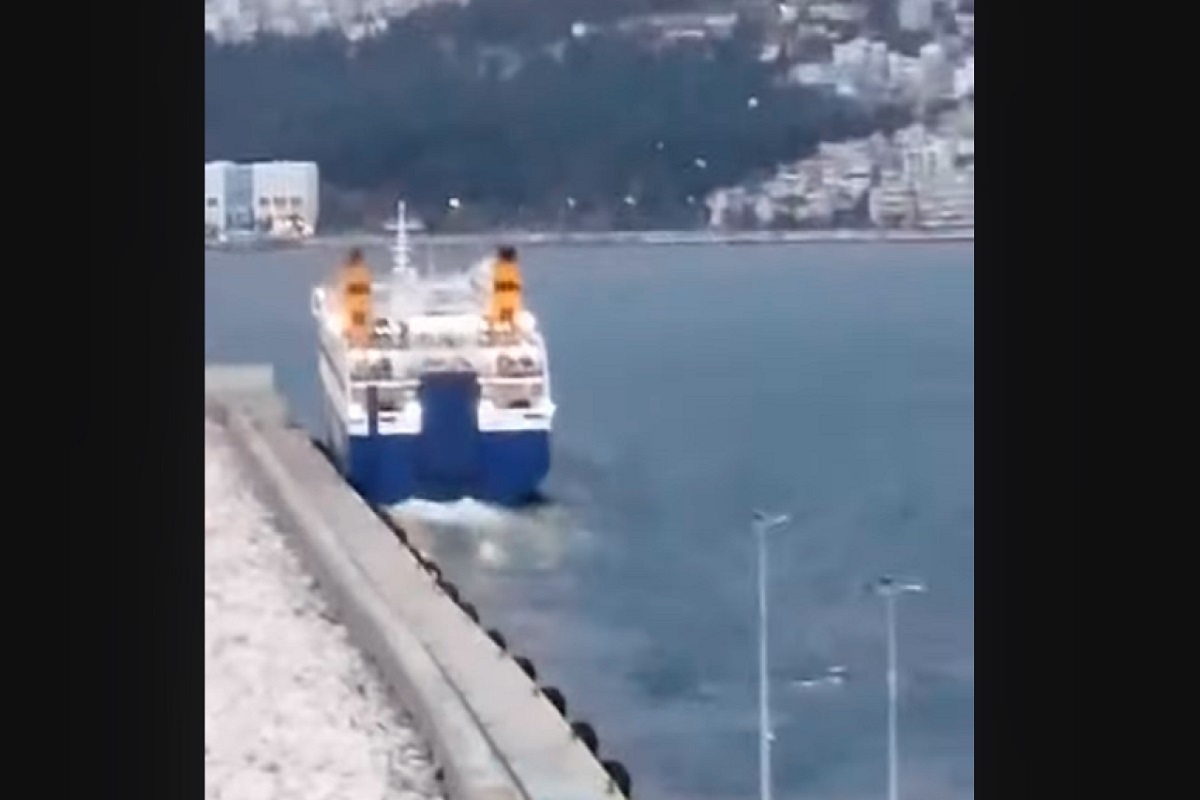 Σύμφωνα με πληροφορίες, λόγω κακοκαιρίας, το πλοίο “σύρθηκε” στον λιμενοβραχίονα.