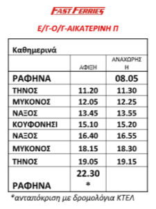 H Fast Ferries είναι στην ευχάριστη θέση να σας ενημερώσει ότι τη θερινή περίοδο του 2021 εντάσσεται στα δρομολόγια μας και το Κουφονήσι, με καθημερινά δρομολόγια από και προς Ραφήνα, για την περίοδο 5/7 έως 6/9 μέσω Τήνου, Μυκόνου και Νάξου ως ακολούθως: