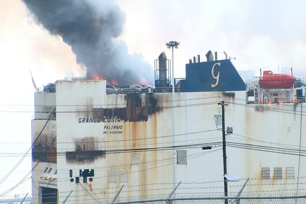 Η πυρκαγιά έχει εξαπλωθεί στην υπερκατασκευή ενώ υπάρχουν και φλόγες και καπνός στο κατάστρωμα, με το θετικό της υπόθεσης να είναι ότι οι πυροσβεστικές δυνάμεις έχουν καταφέρει να περιορίσουν τη φωτιά στο πίσω μέρος του πλοίου.