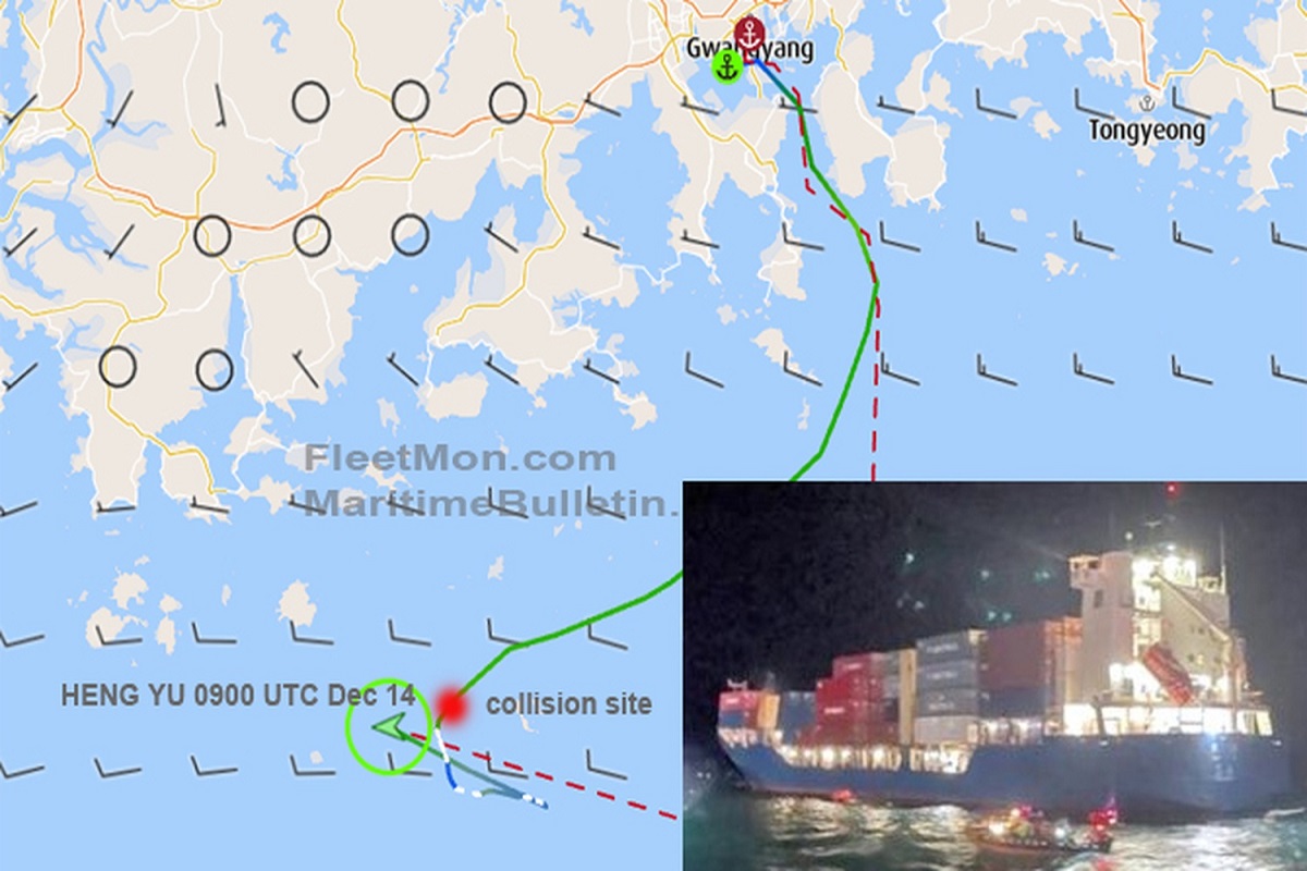 Το κινεζικό πλοίο μεταφοράς εμπορευματοκιβωτίων HENG YU συγκρούστηκε με κορεατικό αλιευτικό σκάφος 129 τόνων, περίπου 50 ναυτικά μίλια νοτιοδυτικά του Yeosu της Νοτίου Κορέας στην Ανατολική Κινεζική θάλασσα, το πρωί στις 14 Δεκεμβρίου.