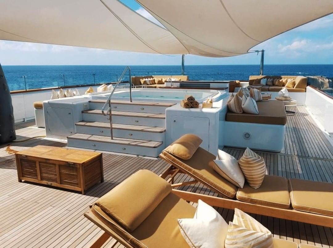 Στην πρύμνη, μια πλατφόρμα κολύμβησης μπορεί να επεκταθεί από το σκάφος και υπάρχει άφθονος αποθηκευτικός χώρος για παιχνίδια νερού. Το SURI είναι ένα ολόλευκο γιοτ με σχετικά μικρά, τετράγωνα παράθυρα, προστατεύοντας τους επισκέπτες του από τις δύσκολες καιρικές συνθήκες και συμβάλοντας στα μέγιστα επίπεδα ιδιωτικότητας. Παρέχει ευρύχωρους χώρους στο κατάστρωμα με άνετα καθίσματα που συνοδεύονται από φανταστική θέα. Το πάνω κατάστρωμα είναι ένας από τους πιο εμφανείς εξωτερικούς χώρους που μπορεί να καλυφθεί από μεγάλες τέντες εάν απαιτηθεί. Υπάρχει ένα τζακούζι στο κατάστρωμα και ένα υπαίθριο μπαρ, καθώς και μια μεγάλη τραπεζαρία που μπορεί να φιλοξενήσει ένα μεγάλο αριθμό ανθρώπων. Ενώ η υπερκατασκευή του γιοτ βρίσκεται πολύ κοντά στην πλώρη, υπάρχει ακόμα ένα μικρό ιδιωτικό κατάστρωμα κρυμμένο κάτω από τη γέφυρα, το οποίο είναι το ιδανικό μέρος για να παρακολουθήσετε το ηλιοβασίλεμα.