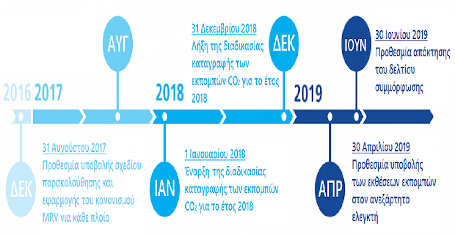 Οι εκθέσεις πρέπει να υποβάλλονται στους ελεγκτές το αργότερο έως τις 30 ΑΠΡΙΛΙΟΥ του έτους που ακολουθεί το έτος καταγραφής. Έτσι για το έτος 2018 η υποβολή των εκθέσεων θα πρέπει να γίνει το αργότερο έως τις 30 Απριλίου του 2019. Κατόπιν ο ελεγκτής εκτιμά τη συμμόρφωση της έκθεσης εκπομπών CO2 με τις απαιτήσεις του συστήματος MRV και αν όλα είναι σωστά, εκδίδει έκθεση επαλήθευσης στην οποία δηλώνει ότι η έκθεση εκπομπών επαληθεύθηκε και κρίθηκε ικανοποιητική. Η διαδικασία αυτή και η έκδοση του δελτίου συμμόρφωσης θα πρέπει να έχουν ολοκληρωθεί το αργότερο έως τις 30 ΙΟΥΝΙΟΥ του έτους που ακολουθεί το έτος καταγραφής. Έτσι έως τις 30 Ιουνίου του 2019, όλα τα πλοία θα πρέπει να διαθέτουν το δελτίο συμμόρφωσης.