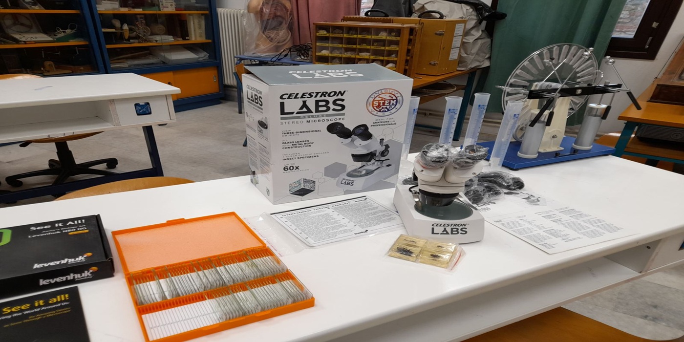 Η δωρεά περιλαμβάνει Στερεοσκοπικό Μικροσκόπιο, σετ ογδόντα βιολογικών παρασκευασμάτων, ηλεκτροστατική μηχανή Wimshurst, τέσσερα αναλογικά βολτόμετρα, τέσσερα αναλογικά αμπερόμετρα, δύο εργαστηριακούς ηλεκτρονικούς ζυγούς ακριβείας, τέσσερις ογκομετρικούς κυλίνδρους πλαστικούς, τέσσερα ηλεκτρονικά χρονόμετρα, μπαταρίες για δημιουργία κυκλωμάτων, οκτώ καλώδια μπανάνα-κροκοδειλάκι, πέντε χαρτιά χρωματογραφίας, τρία πουάρ τριών βαλβίδων, υδροξείδιο του νατρίου, έξι πεχαμετρικά χαρτιά, πέντε σταγονόμετρα πλαστικά και ελαστικούς σωλήνες συνολικού μήκους τριών μέτρων.