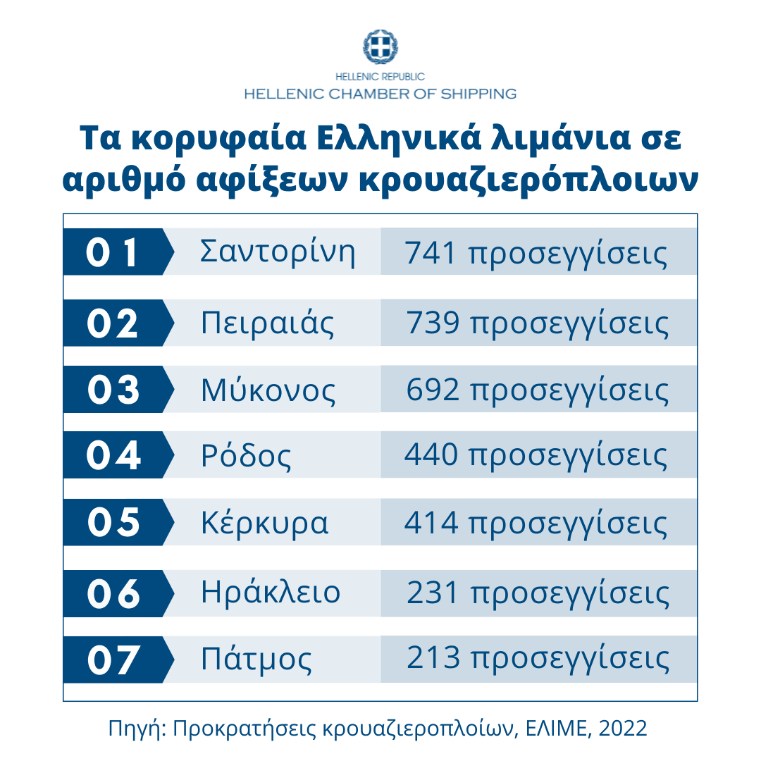 Σύμφωνα με τον προγραμματισμό των εταιρειών κρουαζιέρας, οι 7 πρώτοι προορισμοί σε αριθμό αφίξεων κρουαζιερόπλοιων για φέτος είναι το λιμάνι της Σαντορίνης με 741 προσεγγίσεις, ο Πειραιάς με 739, η Μύκονος με 692, η Ρόδος με 440, η Κέρκυρα με 414, το Ηράκλειο με 231, και η Πάτμος με 213.