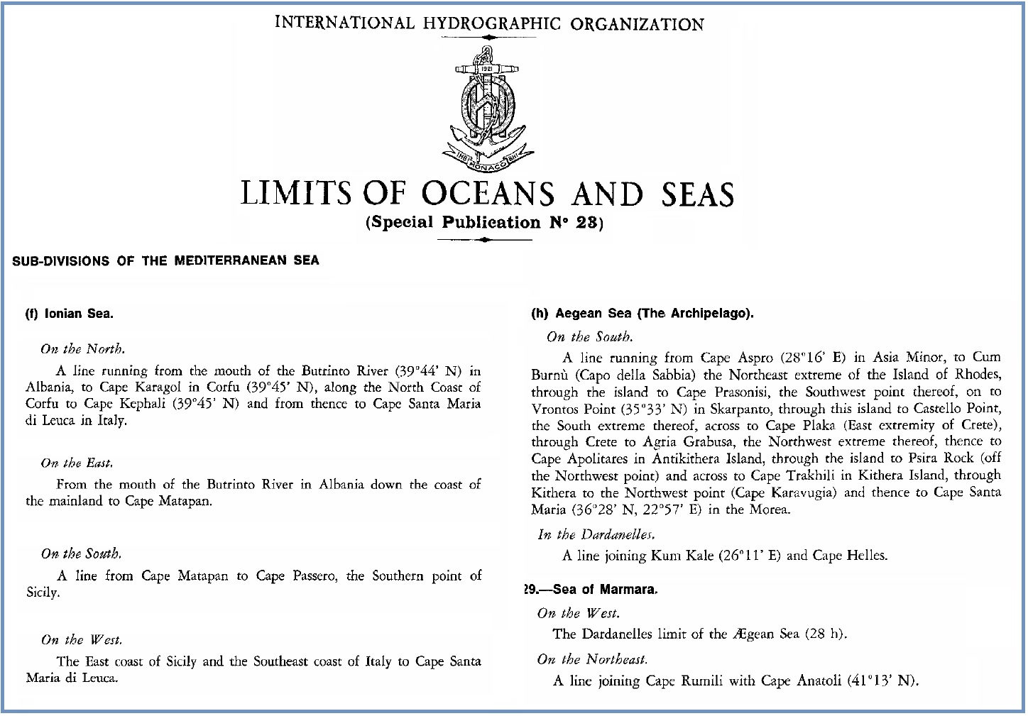 Το εγχειρίδιο αυτό, στο περιεχόμενο του οποίου συμφώνησαν όλα τα κράτη και η Τουρκία, αναφέρει τα ονόματα όλων των θαλασσών της υδρογείου και δεν είναι δυνατόν να αλλάξει και να καθιερωθεί ένα νέο όνομα αν δεν συμφωνήσουν όλα τα κράτη μέλη δηλαδή και η Ελλάδα.
