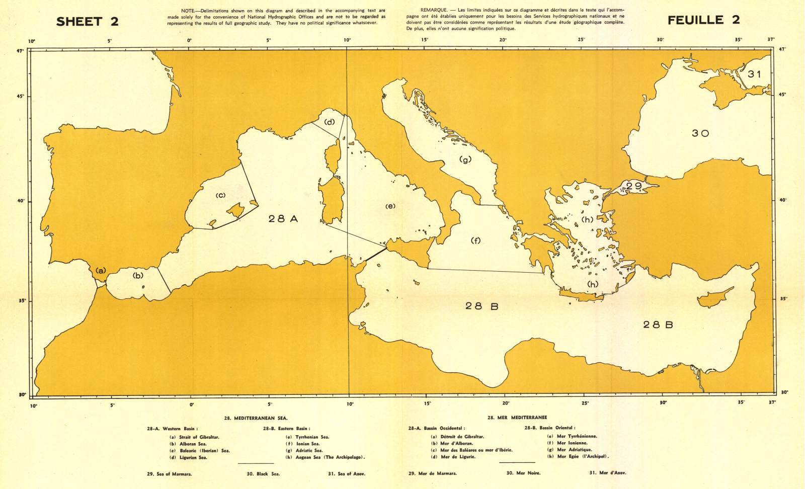 Τα συμφωνηθέντα στον ΙΜΟ όρια των πελάγων και των θαλασσών για την Μεσόγειο φαίνονται στον παρακάτω χάρτη που περιέχεται στην 3η έκδοση του σχετικού εγχειριδίου (1953).