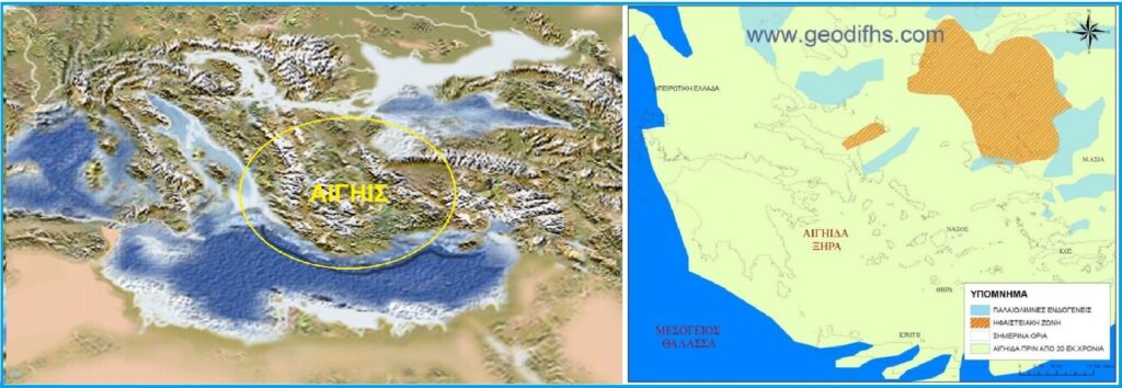 Από την εποχή του Ανώτερου Καινοζωικού, δηλαδή των τελευταίων 23 εκατομ. χρόνων περίπου και του Κατώτερου Μειόκαινου (Ακουιτάνιο), δηλ. πριν από 22,5 εκατομ. χρόνια, και την εποχή των παγετώνων, η Ευρώπη, η Αφρική και η Ασία ήταν ενωμένες στη δε Μεσόγειο υπήρχαν δύο ξεχωριστές λιμνοθάλασσες. Το μέρος που δεν καλυπτόταν από πάγους αποτελούσε την χώρα της Αιγηίδος που περιελάμβανε τη σημερινή Ελλάδα και μέρος της Μικράς Ασίας.