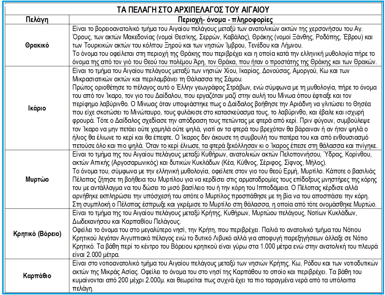 Η θάλασσα του Αιγαίου, βρέχει τις ανατολικές ακτές της Πελοποννήσου και της Ηπειρωτικής Ελλάδας, τις ακτές της Μακεδονίας και Θράκης, τις ανατολικές Μικρασιατικές ακτές, τις ακτές των Δωδεκανήσων και τις βόρειες ακτές της Κρήτης. Η έκταση της είναι περίπου 240.000 τ.χ το δε μέγιστο βάθος είναι 2.249 μ. πού βρίσκεται στη περιοχή μεταξύ Κρήτης-Κυκλάδων. Στο Αιγαίο ανήκουν και πέντε μικρότερα πελάγη εκ των οποίων ένα πήρε το όνομα του από την Μυθολογία (Μυρτώο) ενώ τα υπόλοιπα από τη γή ή τα νησιά που περιβρέχουν (Θρακικό, Ικάριο, Κρητικό, Καρπάθιο).