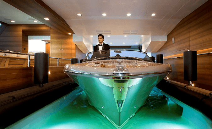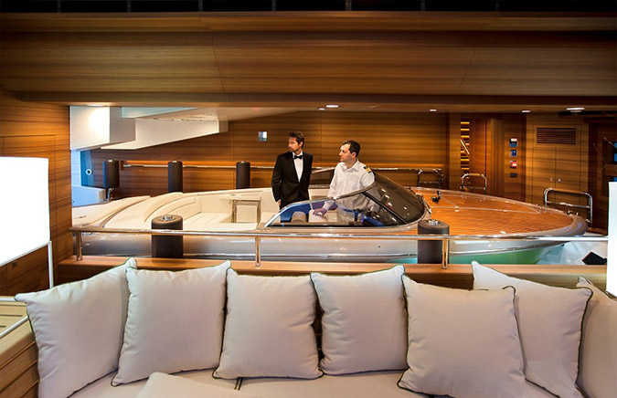 Η αλήθεια είναι το σκάφος μπορεί να φιλοξενήσει, μεταξύ άλλων, στο εσωτερικό του ένα ταχύπλοο μήκους οκτώ μέτρων, με απόλυτη άνεση, ενώ όταν το «γκαράζ» του είναι άδειο μπορεί να μετατραπεί σε μια ιδιωτική, φυσική πισίνα!