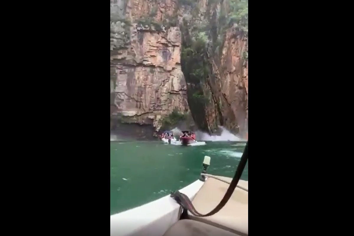 Στο βίντεο βλέπουμε μια συγκέντρωση μικρών σκαφών να κινούνται αργά κοντά στον βράχο στη λίμνη Furnas όταν αυτός σχίστηκε και μια τεράστια πλάκα έπεσε πάνω σε τουλάχιστον δύο από τα σκάφη.